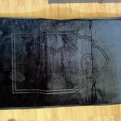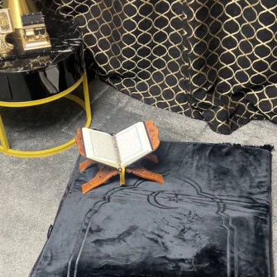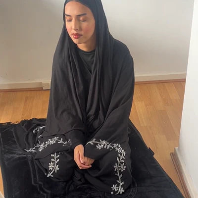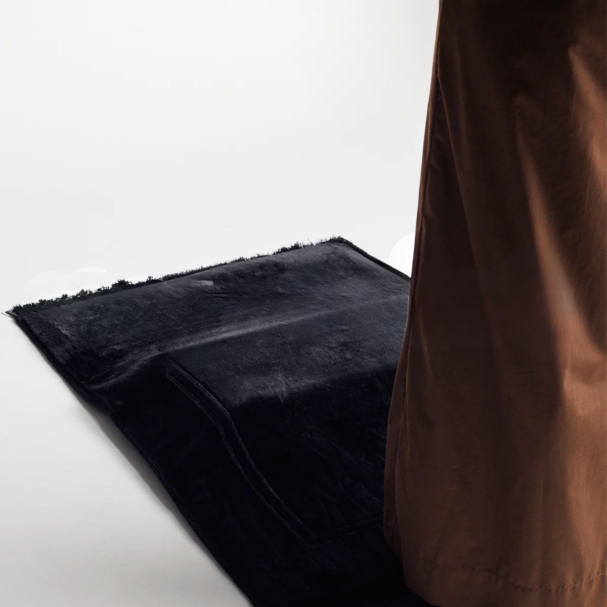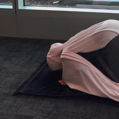الركوع على طبقة متطورة من جلّ الهواء مع إسفنج الذاكرة، حيث تقوم سجادة ErgoSalah بتوزيع الضغط بشكل متساوٍ، وتخفف الألم، وتدعم صحة الركبتين، كما هو موضّح في الصورة السفلية.